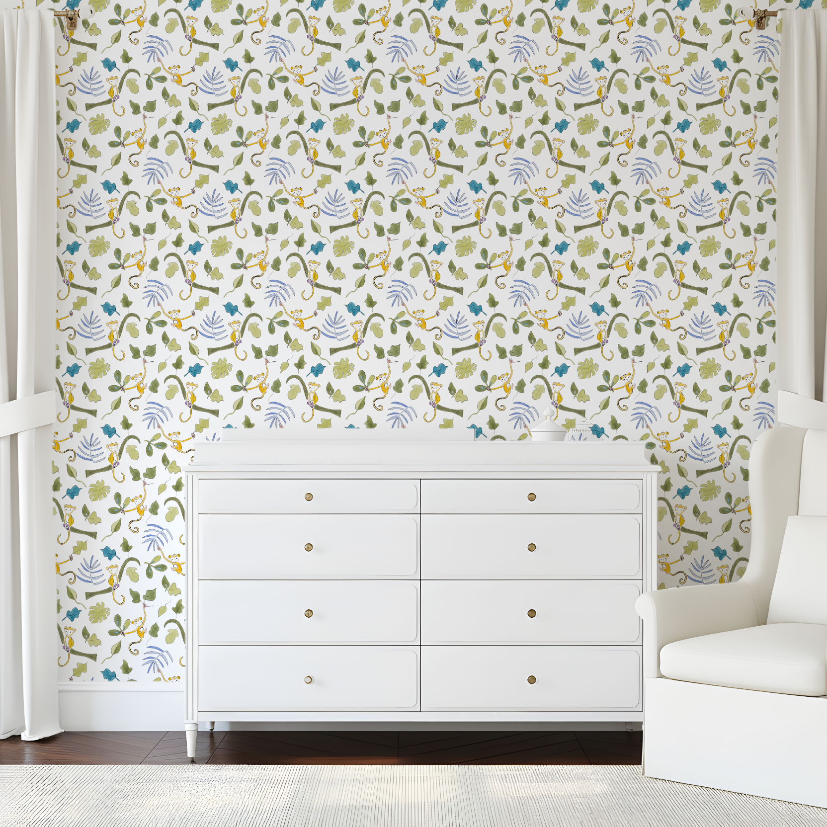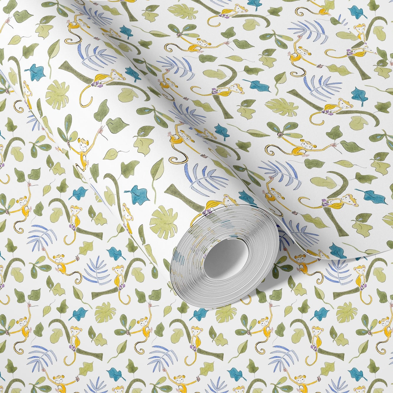 Dancing monkeys weave through lush botanical surroundings in a pattern that entertains in adorable fashion. Ideal for children's rooms and nurseries seeking character with lasting appeal, this pattern is available on Premium Matte paper and Grasscloth.